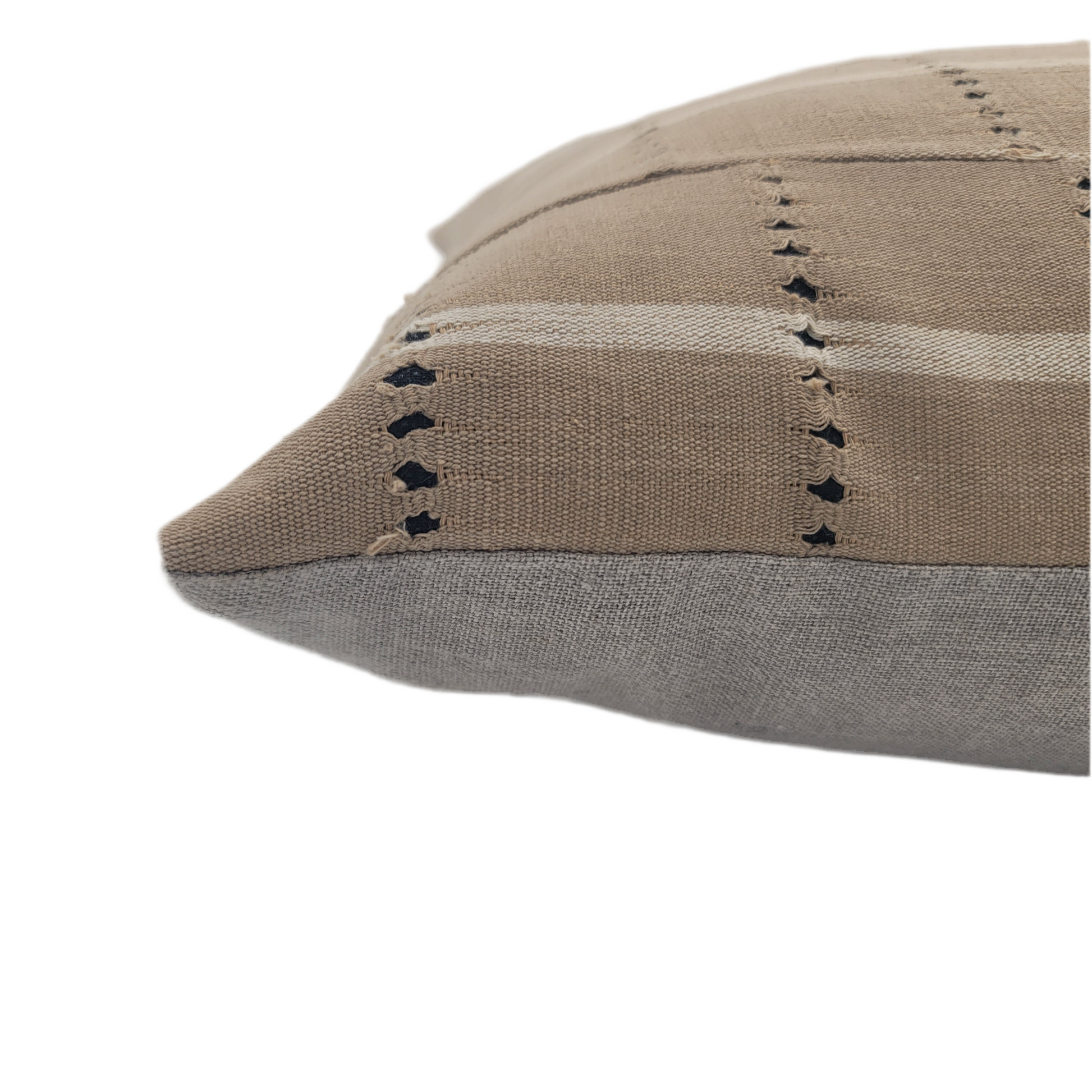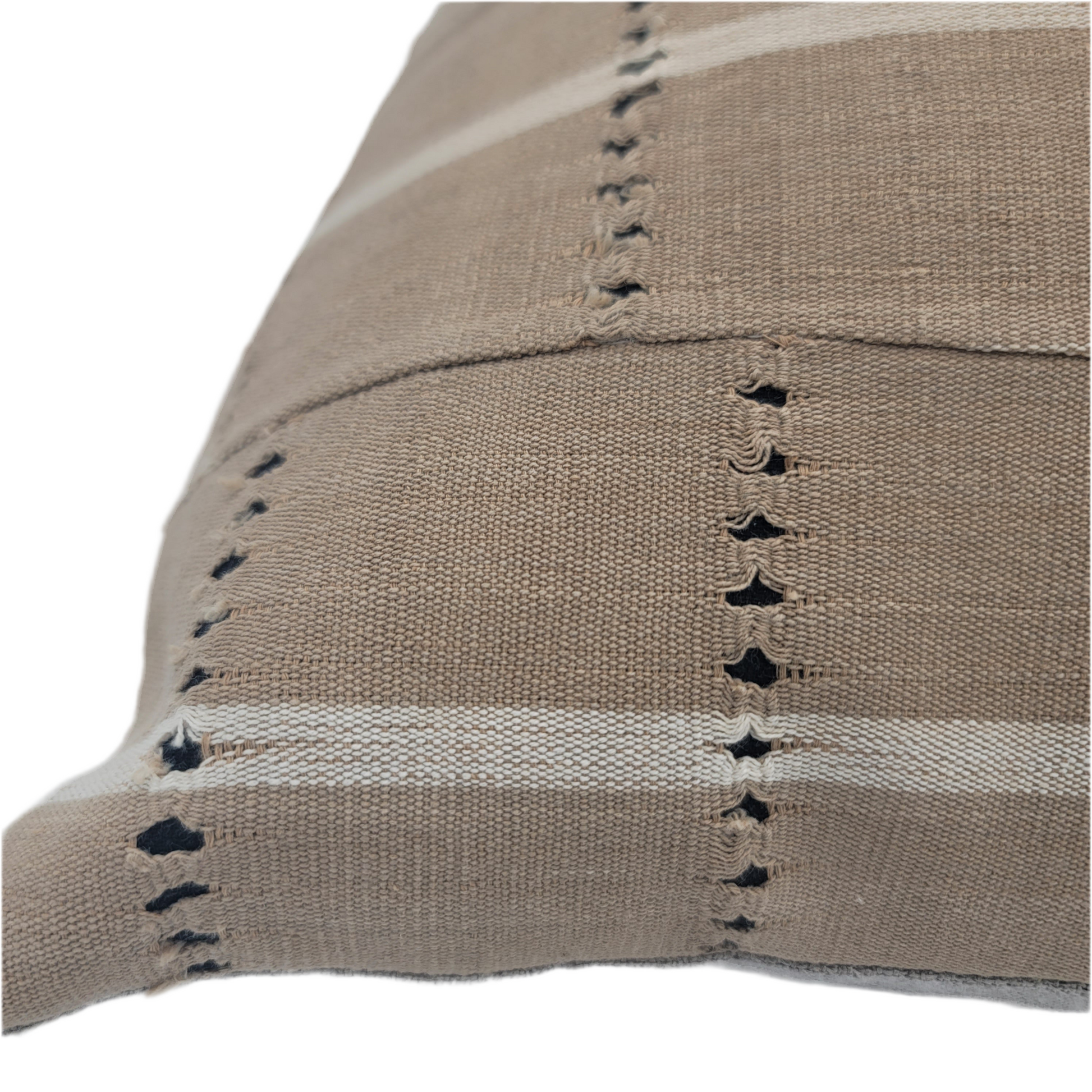 This pillow boasts a luxe sand color base with bold embroidered and cream stripes, enhanced by intricate cutout details for a touch of texture and contrast. This striking piece adds a modern yet timeless flair to any room, perfect for sofas, beds, or accent chairs.