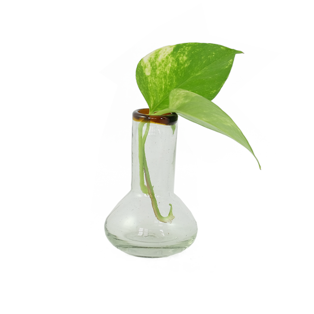 A delicate handblown vase designed for single stems or dried florals. Its rounded silhouette and subtle amber rim add a warm, vintage-inspired touch to tables, shelves, or bedside spaces.